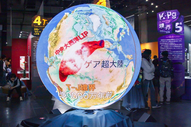会場の真ん中にあるのは“大絶滅スフィア”。球形の映像展示で、大絶滅のきっかけとなるできごとが、地球上のいつどこでどのような規模で起こったかが映像化されています。