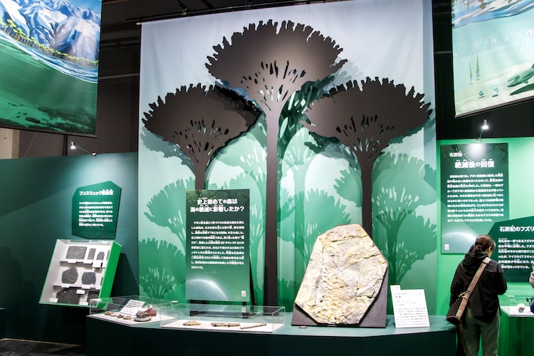 本展では、1回の大絶滅ごとに章立てがされていて、章ごとにコーナーが分けられています。各コーナーは大絶滅が起こる前後で壁が色分けされているので、大絶滅による生態系の変化がとてもわかりやすくなっています。また、各章ごとに当時を再現したイラストも飾られているので、生物たちが暮らしていた環境も想像しながら会場を回るとおもしろいですよ!